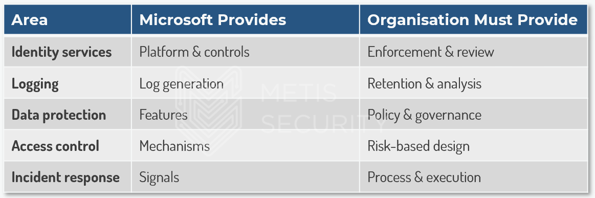ISO 27001 explicitly assumes shared responsibility. Vendor assurances do not remove the need for organisational control. Auditors will expect clarity on what Microsoft provides and what the organisation actively manages.