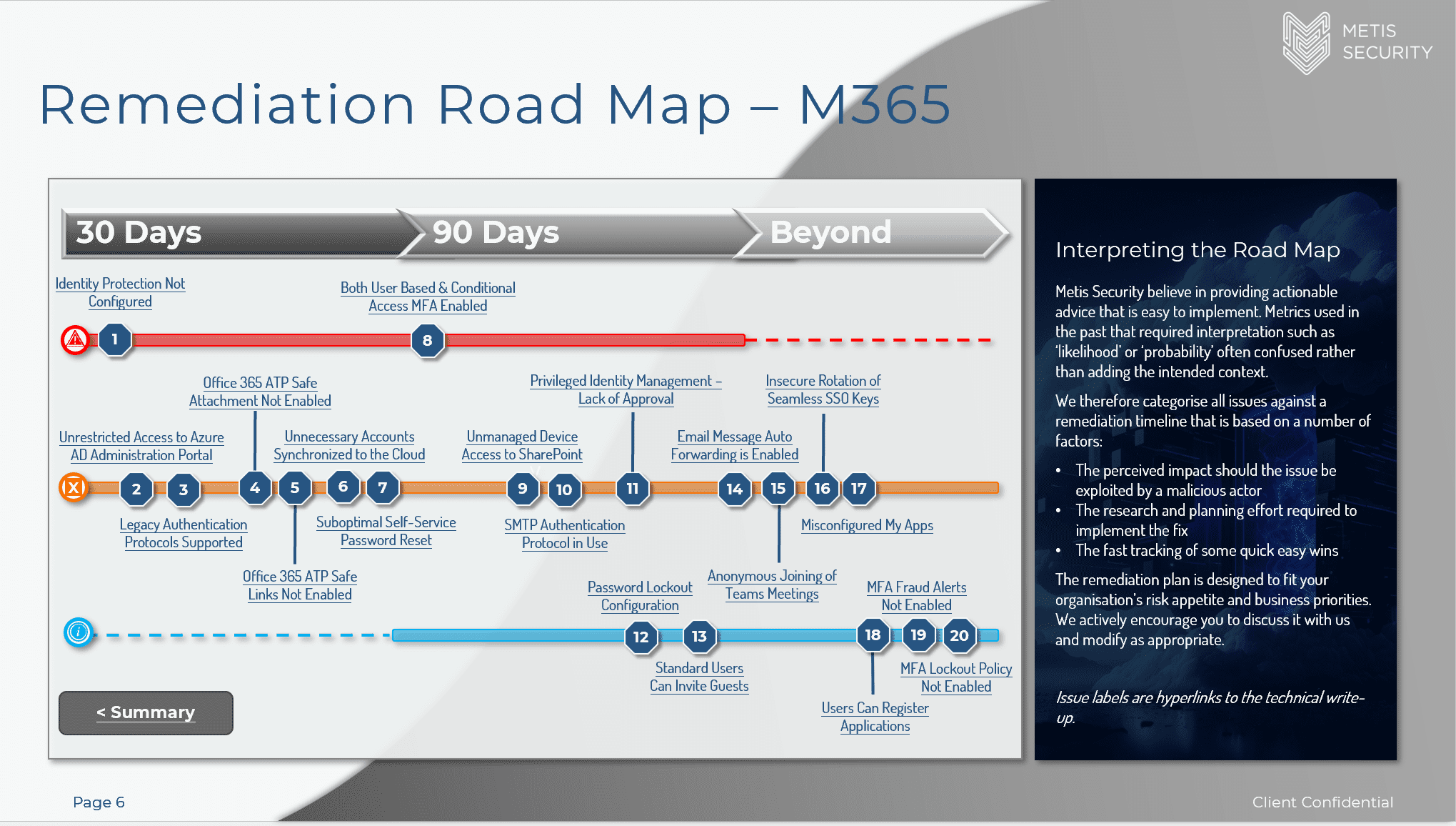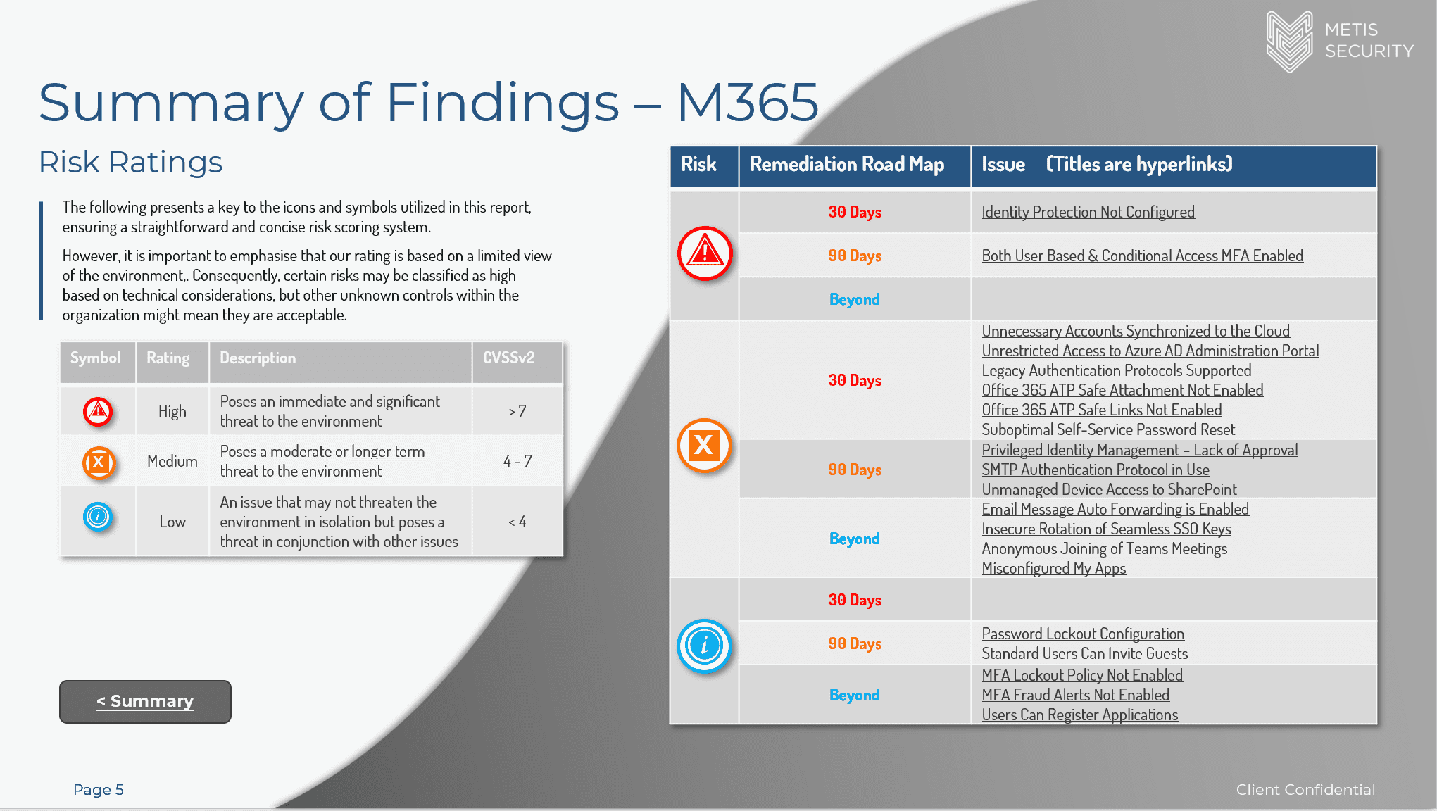 Hyperlinks to the issue summary and remediation plans for that phase of the engagement to allow for easy and rapid navigation of the report.